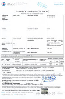 汉斯曼集团公司(HQTS)是国内本土规模最大的第三方检验结构,集团公司旗下子公司-艾斯特(ASCO)是经伊朗官方(ISIRI)认可并授权的检验机构,有权限对出口伊朗的产品进行检验并签发VOC(也叫COI)证书;产品经检验合格后最快3个工作日内可以出具证书,价格相比其他公司更优惠。我们不仅可以作为第三方参与验货还可以出具VOC/COI证书以及IC证书。
