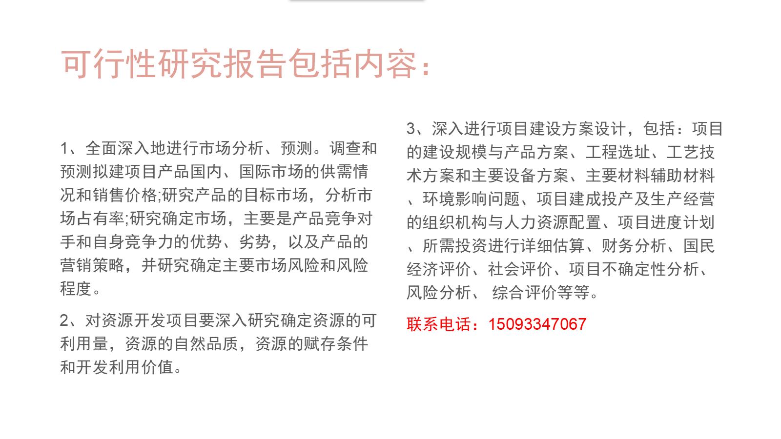 可行性研究报告分为审批核准用可行性研究报告和用可行性研究报告。审批核准用的可行性研究报告侧重关注项目的社会经济效益和影响;用报告侧重关注项目在经济上是否可行。一份高的可行性报告,能够的通过的审批,很快的资金。因此可行性报告的好坏,决定了项目是否能够成功的落地实施。