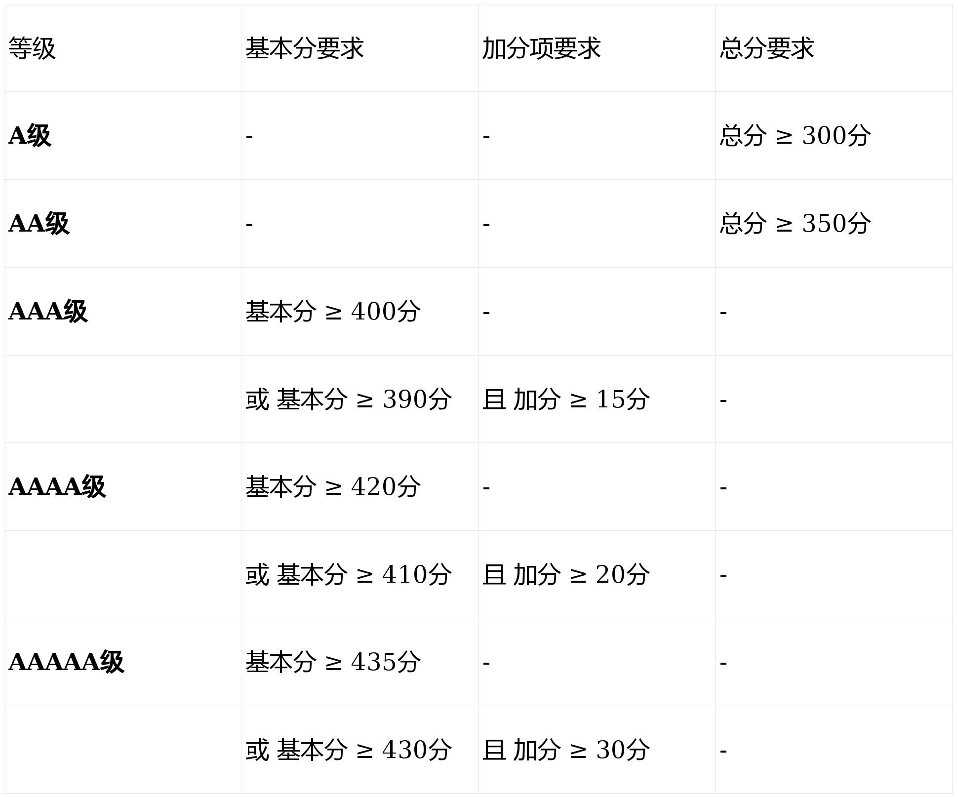评价总分500分(基本分450分 + 加分项50分),等级判定依据如下: