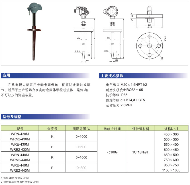 由于针对不同温度范围及被测介质而采用不同的高强度耐磨保护管及表面改性措施,构成复合管型实体化结构本系列产品适用于对保护管磨损严重的石油化工,输煤系统,流化床式锅炉,水泥熟料及耐火材料等流动粉体及物料的温度测量。进一步提高热电偶的使用寿命。其性能优于现行耐磨热电偶,博得用户好评。拥有多项高科技的产品处于国际领先水平,其特殊工艺的耐磨材料在不影响测温滞后的前提下,彻底解决了循环流化床锅炉测温热电偶的使用寿命,保护套管具有耐磨,耐高温氧化,耐硫化、耐液态铁粉、石灰石等水泥料腐蚀,抗冲刷,耐振动诸多技术,使测温热电偶使用寿命一般一至两年。