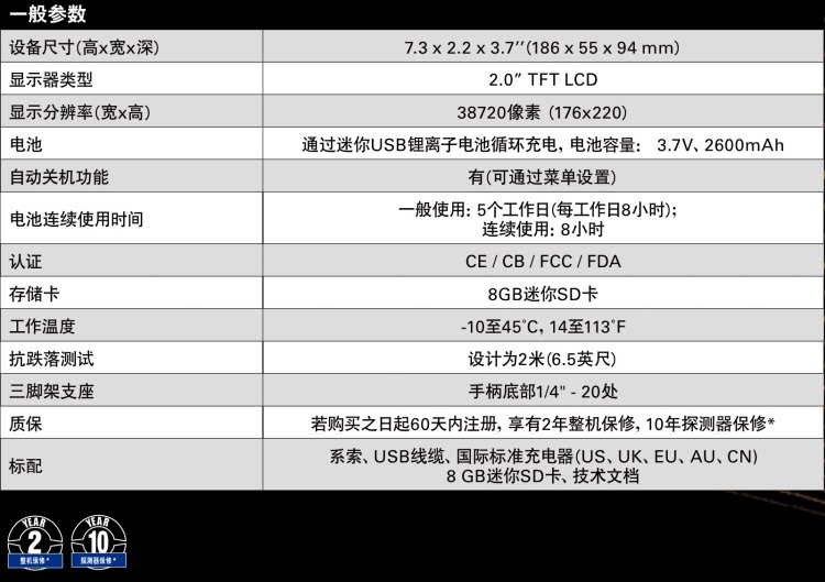 | 图像存储容量 | 8 GB Micro SD卡可存储75000个图像 |