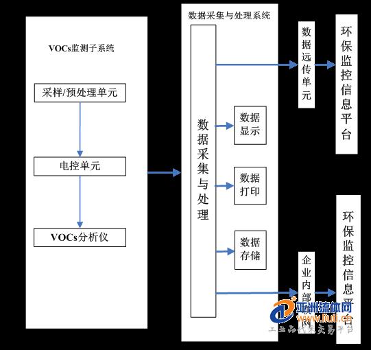 其中挥发性有机物和特征污染物监测子站包括采样及预处理单元、气体分析仪器、气象监测仪、数据采集与处理系统、系统辅助设备(零气产生器、氢气产生器、标准气体、机柜等)、站房及配套设备设施等。子站监测的数据传送至市环境监测中心站进行实时控制、数据管理及图表生成。TR-9300V型污染源挥发性有机物(非甲烷总烃、苯系物)在线监测系统由在线样品前处理子系统、JNYQ-THC-51型在线气相色谱仪、数据采集及处理子系统组成。