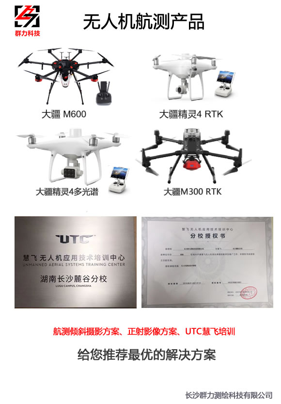 长沙群力测绘科技有限公司定位全国三维地信高端服务品牌;公司是大疆湖南省测绘行业授权服务商、广州红鹏倾斜摄影相机总代理、赛尔五镜头倾斜相机总代理、优立海量三维数据处理服务中心,同时创办了湖南麓谷航测分校、徕卡湖南授权经销商,设航测内业数据处理中心、三维应用研发中心、无人机航测飞行大队。现有5架中云图F8固定翼长航时无人机、大疆经纬M300 RTK及精灵P4M、2架大疆经纬M600Pro、2架精灵4RTK及4架精灵4Pro V2.0无人机、1套红鹏大金牛AP4300R/AP3400R倾斜摄影相机,长期服务全国地理信息行业,在测量测绘、应急救灾、城乡规划、森林资源监测、智慧农业、河道、矿山测绘、电力巡检、深耕等众多行业得到广泛应用。