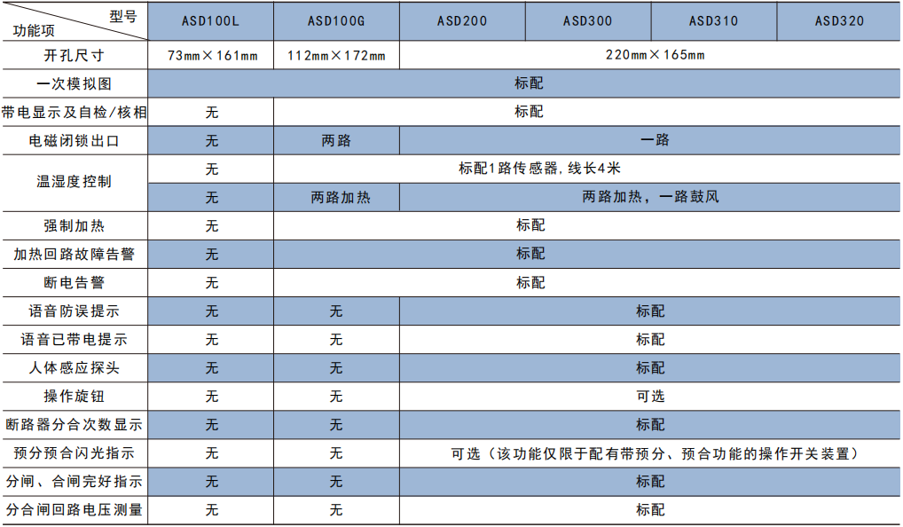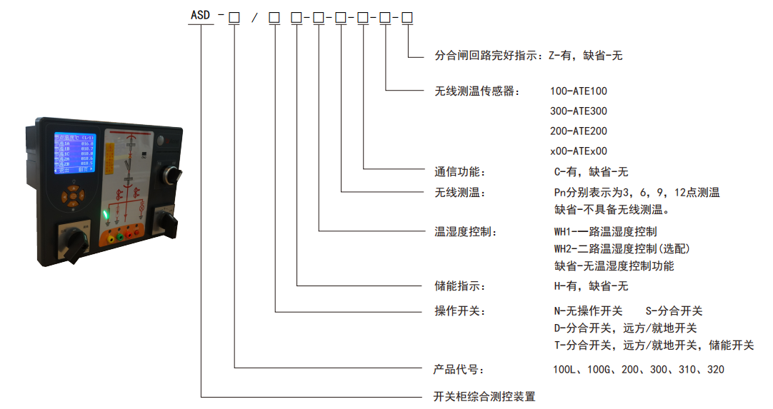 ASD系列开关柜综合测控装置具有一次回路模拟图及开关状态指示、高压带电显示、自动温湿度控制、人体感应自动照明、语音提示、电参数测量及RS485通讯接口等功能,集操作、显示于一体,直观地体现柜内元件的工作状态及工作环境。