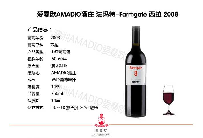 品牌介绍:爱曼欧品牌于06年参加了上海国际酒展,并成为唯一得金奖的澳大利亚红酒商,07年爱曼欧系列开始进驻中国市场,目前主要在上海,江苏,浙江,广东的商超,酒类专卖店,高档餐厅及会所销售。最近,爱曼欧更获得了2009年香港国际葡萄酒展的金奖并被国泰航空指定为澳洲航线的头等舱唯一用酒;2010年上海国际葡萄酒展金奖;2010年5月登上了美国纽约时代杂志的年度红酒特辑,被评选为本年度全球10大最完美且不可错过的葡萄酒。