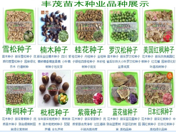 丰茂苗木种业主要销售:苗木种子、花卉种子、林木种子、造林种子、草坪种子、地被种子、护坡种子、果树种子、水培种子、药物种子、油料种子、原料种子、进口种子、各种植物种子等;千余品种、批发零售、保质保量、诚信经营、真诚为您服务,欢迎各界新老朋友来人来电洽谈订购,所有种子一律快递、物流配送,量大优惠。