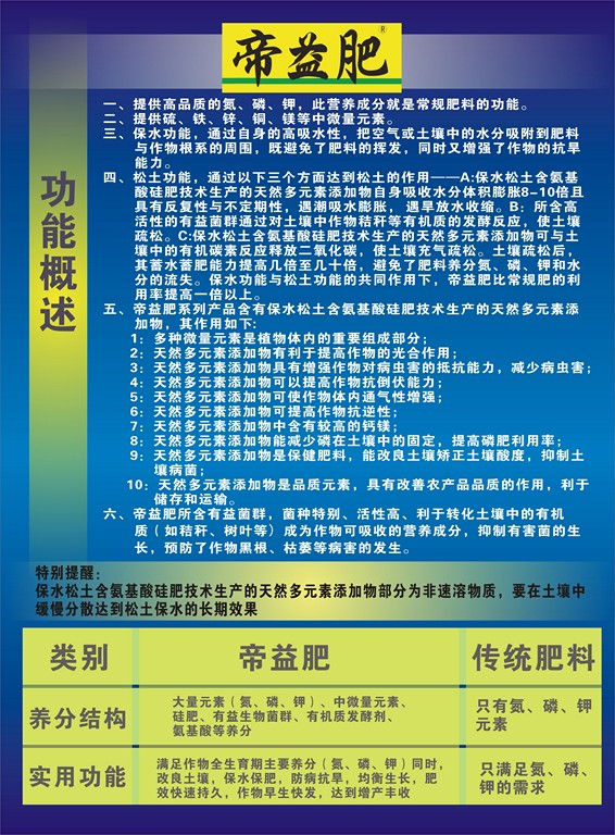 帝益肥的诞生,为中国土地增添了一抹生机与活力,帝益肥自成立至今,已申报国家专利11项,产品品种达50多个。帝益人围绕“节肥养地”的企业宗旨,躬行深耕,用智慧和汗水凝聚出:保水松土功能肥料----“帝益肥”,开创了中国新型功能肥料的新时代。