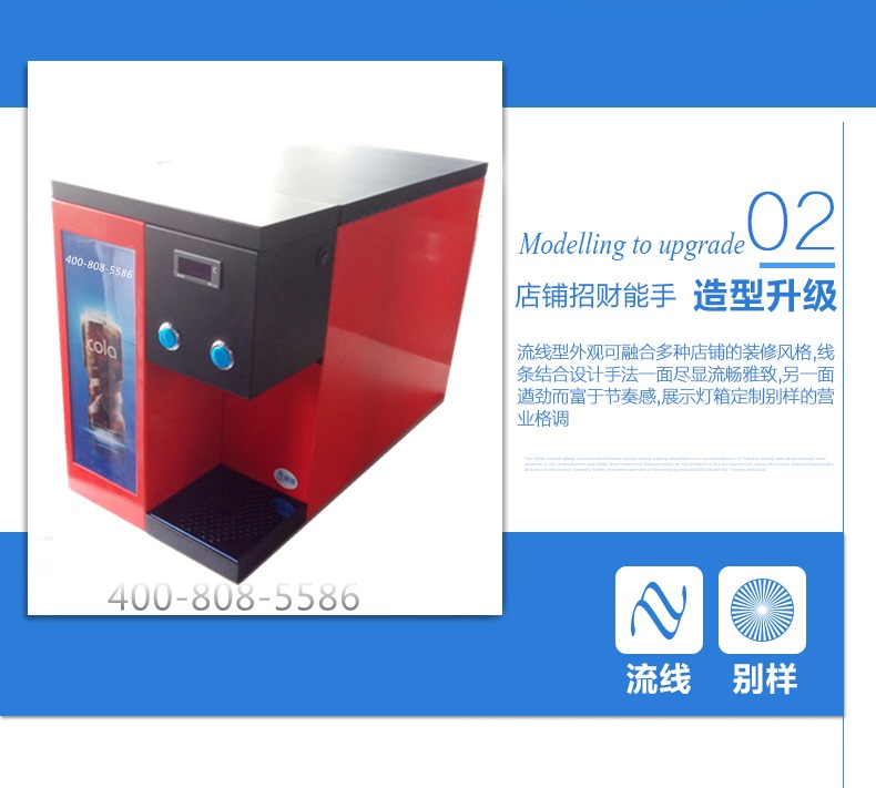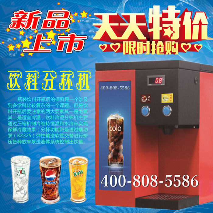 1.桌上型直饮机利用分杯技术,无需水源,气源就可以现场调制出碳酸、果汁、颗粒、椰子等饮料;