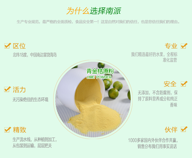 南派青金桔原粉选用海南岛独特的青金桔鲜果肉榨浆,经世界先进的喷雾干燥工艺技术加工制成,有效保持了新鲜青金桔的营养成份和香味,即时溶解,使用方便。