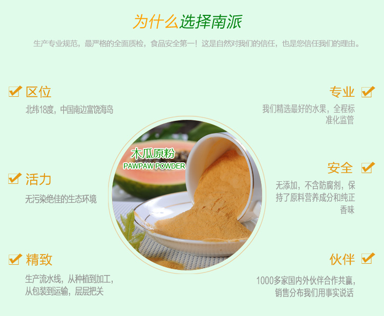 南派木瓜原粉选用海南岛无污染的鲜木瓜榨浆,经世界领先喷雾干燥工艺加工而成。富含丰富的木瓜蛋白酶、凝乳蛋白酶、维生素A和C,胡萝卜素及17种氨基酸等,木瓜原粉不但营养丰富,在中医药方面功效也独特,多吃不仅健胃消食,舒筋活胳,治腰酸背痛,降血压还有抗菌消炎,抗衰美颜,提高免疫等保健功效。