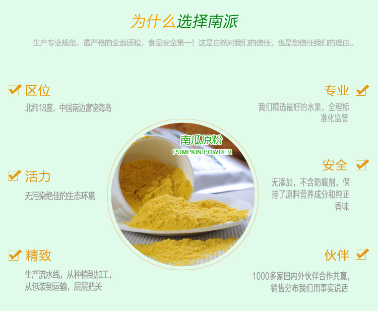 海南岛地处北纬18度,是我国唯一热带岛屿。充足阳光沐浴下生长的南瓜,其香味更加突出,营养更加丰富。南派南瓜原粉选用海南岛无污染的鲜南瓜榨浆,经世界领先喷雾干燥工艺加工而成。富含丰富的维生素、胡萝卜素、矿物质,还有人体必须的八种氨基酸,叶黄素和磷、钾、钙、镁、锌、硅等微量元素。