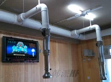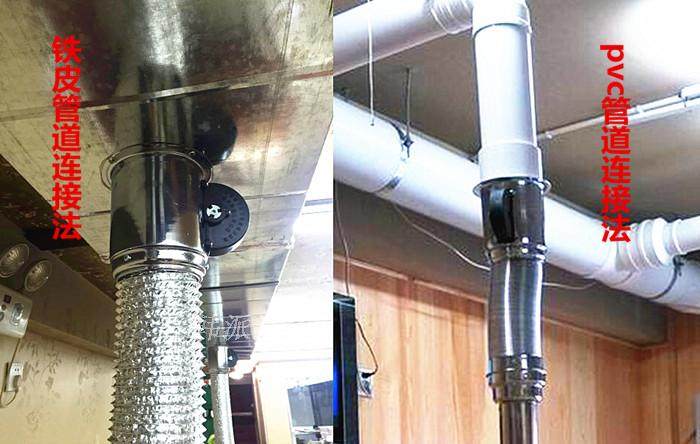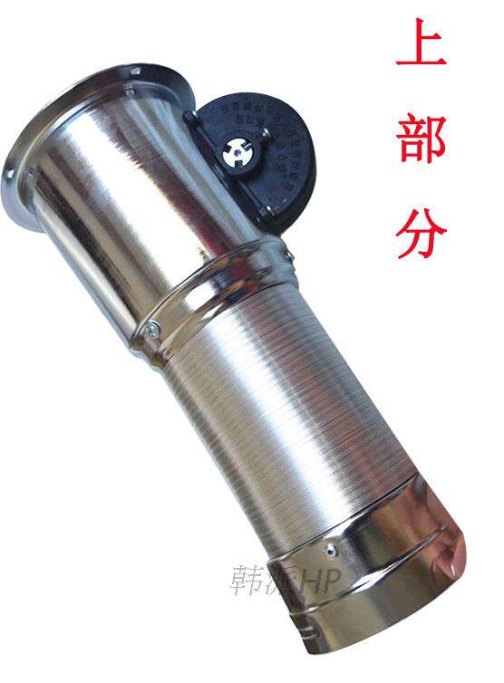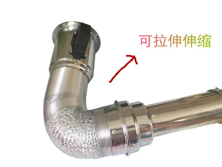 烟管中间铝箔连接管,可伸缩,韩国进口,更耐用。 烟管下面有接油口,配有控制风阀,可根据房屋间距来定做长短。烟管两端的硬管为优质钢材电镀制作,中间采用韩国进口铝箔软管连接,内部配有进口弹簧,上下垂直拉伸到任何位置都可固定住。