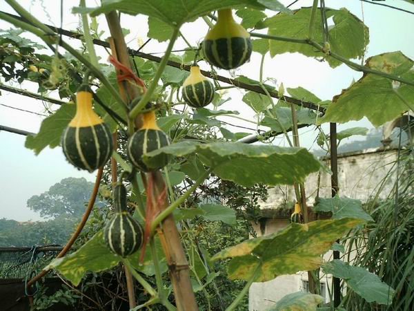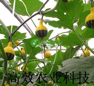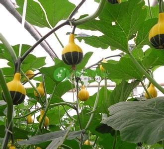 南瓜 是梨形小果,果实底部为深绿色,上方为金黄色,并有淡黄色纵纹相间,呈现明显黄绿双色果。果径4~6厘米,果高8~10厘米,单果重100克左右。叶黄绿色、浅裂,坐果力强,连续结果性好.