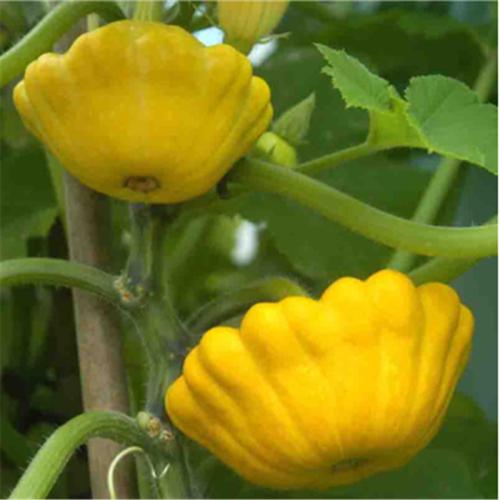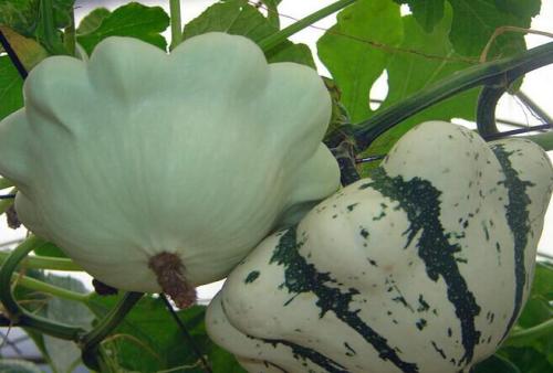飞碟瓜 从国外引进新型特菜,由于瓜形奇特,风味俱佳,炒菜、作汤、作馅均可,矮生不生蔓,瓜色乳白,淡黄色,绿色,扁平圆形,边缘有数量不等凹起似飞轮,似飞碟,甚为好看,具有食用与观赏多种用途。发芽温度18℃~25℃,生长适宜温度15℃~35℃,播种到观赏约50天。