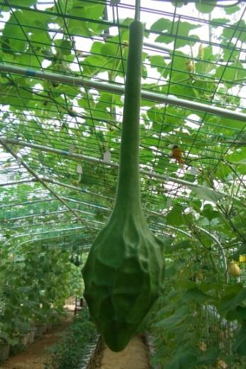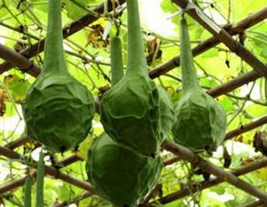 鹤首葫芦,非常奇特的观赏葫芦品种,果实下部是不规则高球形,奇形怪状,表面有明显的棱线突出起,呈不规则凹凸面,颜色墨黑,直径8厘米,高40-60厘米,上方具细长柄,整个葫芦外形酷似“鹤首”,栽后80天结瓜。