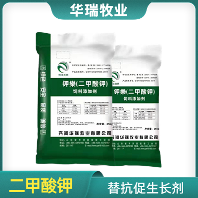 二甲酸钾是欧盟批准的第1个用于替代抗生素的饲料添加剂。2001年,欧盟批准二甲酸钾作为替代抗生素的饲料添加剂用于猪饲料中,2005年批准用于母猪料中;2005年,我国农业农村部批准二甲酸钾用于猪饲料中。二甲酸钾作为一种非抗生素饲料添加剂,具有绿色、无残留、腐蚀性低、刺激性小等优势,在动物消化道内释放缓慢,能够同时发挥甲酸和甲酸钾的功能,有效调节动物胃肠道p H值,改善肠道菌群,促进营养物质的消化吸收。