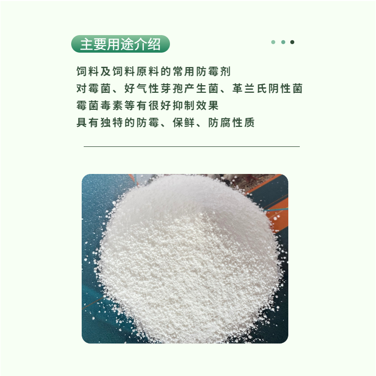 3)丙酸解离出H+可穿透霉菌细胞壁,抑制胞内酶活性,阻碍霉菌繁殖。对需氧芽孢杆菌、黄曲霉有较好的抑制作用。丙酸钙防霉效果受饲料中水分和p H影响。丙酸盐优点在于不挥发、耐高温、刺激性小,适合长期贮存的饲料产品。丙酸钙有较强的抑菌作用, 使用安全。在配合饲料中的添加量为0.3%以下, 它主要是依靠游离的 (-COOH) 破坏微生物细胞或使酶蛋白失活, 从而使微生物的正常代谢受阻。饲料中添加丙酸钙, 可以防止微生物产生毒素, 减少饲料养分的损失, 延长饲料的保质期。饲料的储藏时间、水分含量、营养成分、外界环境、加工成的状态以及包装等是影响饲料程度的重要因素,因此发生霉变的几率也各不相同。为保证饲料的防霉效果,建议选择有效含量更高的纯品。