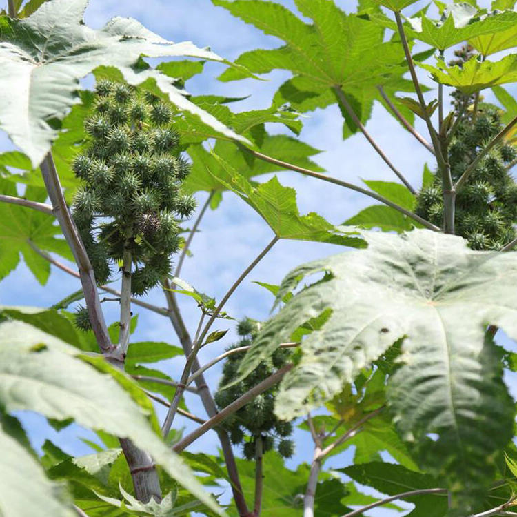 蓖麻是为双子叶植物纲、金虎尾目、蓖麻属一年生或多年生草本植物、热带或南方地区常成多年生灌木或小乔木。单叶互生,叶片盾状圆形。掌状分裂至叶片的一半以下,圆锥花序与叶对生及顶生,下部生雄花,上部生雌花;花瓣性同株,无花瓣;雄蕊多数,花丝多分枝;花柱,深红色。蒴果球形,有软刺,成熟时开裂。花期5-8月,果期7-10月。