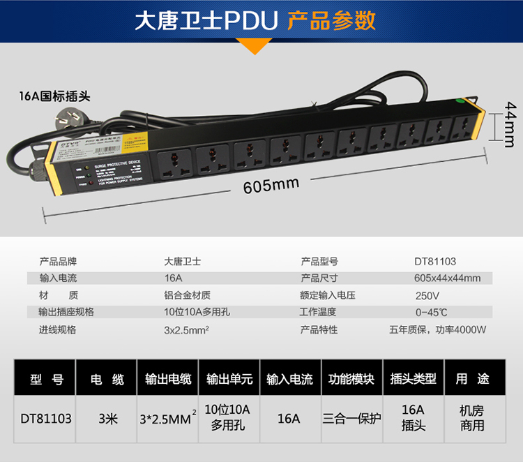 大唐卫士DT81103 PDU电源机柜插座10位多用孔三合一保护pdu电源插排