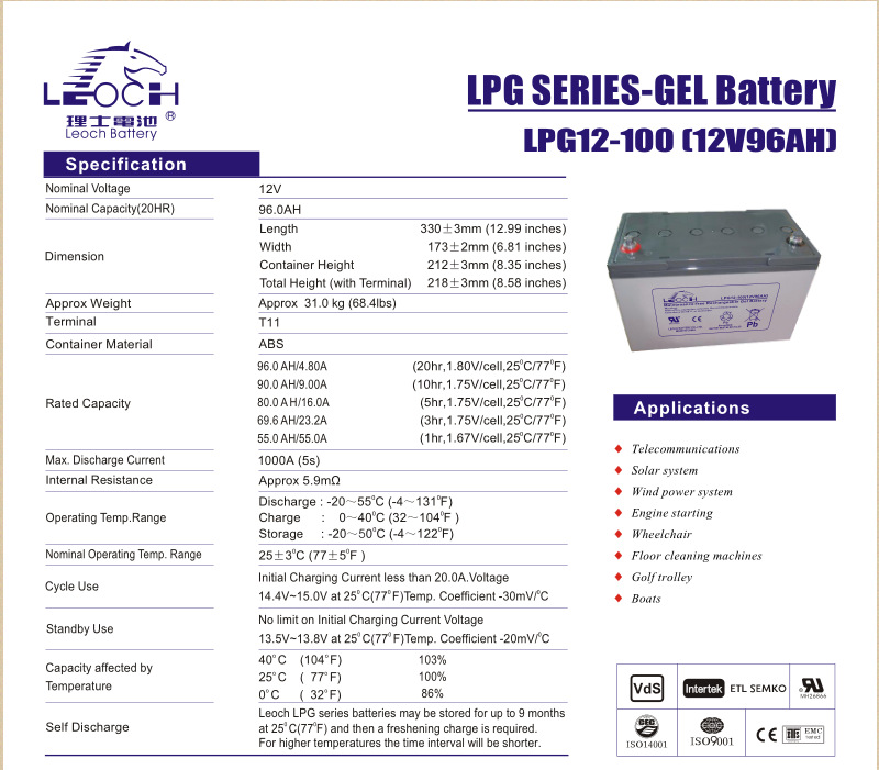 使用温度范围宽。蓄电池充电温度范围0~40℃,放电温度范围-20~55℃,贮存温度范围-15~50℃。LEOCH电池采用独特的合金配方和铅膏配方,在低温下仍有优良的放电性能,在高温下具有强耐腐蚀性能。
