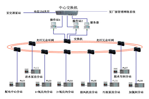 系统以标准的、开放的工业以太网作为系统主干网络,配以高性能、高可靠性的现场控制站组成,并满足安全、实用、经济、高效的要求,达到当前污水厂自动化先进水平。根据工程的实际情况及工艺要求,自控系统采用“集中管理、分散控制、资源共享”的集散型系统。