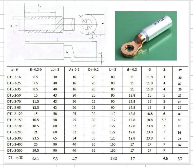 国际标准, 材质铜铝 ,主要适用范围配电装置中各种圆型、半圆扇型铝线、电力电缆与电气设备铜端的过渡连接,配电装置铝芯电缆与电气设备铜端的过渡连接,使用铝材为L3、铜材为T2.产品采用摩擦焊工艺制造,具有焊缝强度高,通电性能好,抗电化腐蚀,使用寿命长等特点。