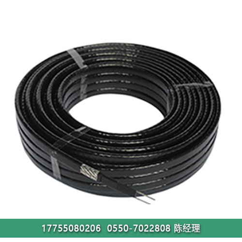 结构:1、铜芯导线;2、导电塑料层;3、绝缘层;4、屏蔽层;5、氟塑料外护套;在基本型的外层再复合一层金属屏蔽网(覆盖密度80%的金属屏蔽层),再外加一层氟塑料外护套,这种结构电伴热带可有效消除静电和抵御外来机械碰境。伴热带具有耐热、耐腐蚀、防水、化学物理性质稳定等特点。还被用于大型管道的防冻保护和工艺管线或容器储罐的防冻和保温,以及水及燃油的伴热,特别是大管径热损失较高之处。
