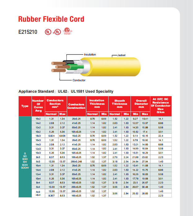 标准:UL62、UL1581 S SO SOO SOW SOOW 600V 橡胶软线