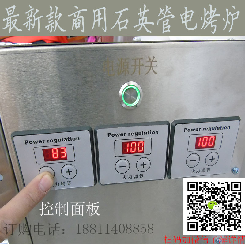 此款为新型石英管烤炉,以前的烤炉温控开关是旋转式,刚刚研制成功的是按键式的开关按钮,新款按键调节温度更方便、更快捷、更准确、烤炉整个机体采用的是不锈钢材质、坚固耐用、清洗方便、健康环保,一个控制按钮是一控,一控是控制六根石英管,烤炉内部是石英管,石英管温度高、功率大、火力旺、烧烤速度快、烤出来的肉串外焦里嫩非常好吃。石英管下边是一个接油盘,开始时再接油盘里放少量的水,避免在烧烤时滴落下来的油脂滴下去发生爆裂的现象 。我们的烤炉采用优质紫铜管,接气嘴要和可靠,用多少年都不会出现漏气的现象,并且可以反复拆卸调换喷嘴,更适合不同地区孔径更换,家用商用都有的,没有太大的烟 ,内外都可以使用,以后朋友聚餐再也不用去外边小吃摊了,不卫生还不好吃买台烤炉想啥时候吃就啥时候吃,干净卫生。小型的那款在室内就可以用,这样即使在寒冷的冬天在家里也可以享受到吃烧烤的乐趣 。