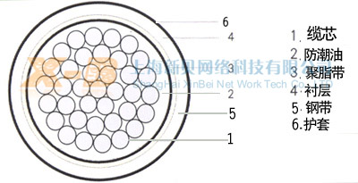 电缆结构特点:HYA型市内通信电缆采用全色谱高密度聚乙稀绝缘,铝塑综合护套(即电缆的纵包屏蔽铝带与护套粘结成一体,形成密封护层),具有电气性能优越,施工方便的特点。