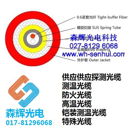 耐高温型铠装测温光缆是由螺旋不锈钢软管内置1~2芯传感光纤,软管外加高模量凯夫拉、不锈钢编织网及铁氟龙外护套组成。由于采用了铁弗龙(四氟乙烯)这种特殊材料,克服了传统螺旋钢管铠装型传感光缆高低温范围狭窄的缺点,使其长期使用温度扩展到-45℃~150℃,最高温度可以达到200℃。此外,铁弗龙材料独特的导热快、绝缘电阻高、耐磨、耐化学腐蚀、不亲水、不亲油、硬度适中等特点,使光缆的适用领域得到极大的扩展。目前产品广泛应用于电力、石化等测温领域。