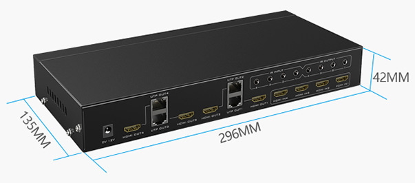●每路HDMI输出拥有一路本地HDMI和一路RJ-45端口的HDMI单网线延长器输出,并且本地HDMI输出和RJ-45端口的HDMI单网线延长器可以同时工作。