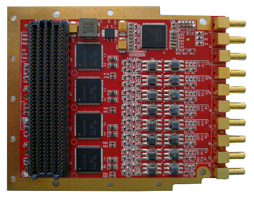 该板卡支持板上可编程采样时钟和外部参考时钟以及采样时钟,多片板卡还可以通过触发(输入/输出)信号进行同步采集,该板卡8路模拟信号通过50Ω特征阻抗的SSMB射频连接器输入,通过巴伦变压器耦合至ADC前端。板卡可广泛应用于通信多载波、雷达与智能天线、测试与测量、软件无线电等。