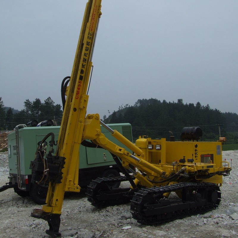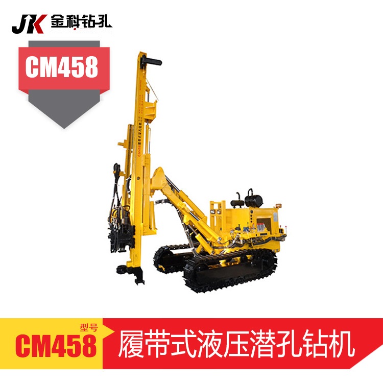 CM458内燃(CM458D电动)履带式多功能锚固钻机采用柴油发动机,电动机液压油泵组为钻机的液压马达行走、回转、推进及提升、油缸摆角定位等提供动力,钻机钻孔作业时只有潜孔冲击器消耗压缩空气。该钻机用于各类锚固支护作业;该钻机也可采用套管跟进护壁成孔工艺钻凿水电围堰注浆孔、堤坝防渗注浆孔、基础加固注浆孔及锚孔等,使用方便灵活。