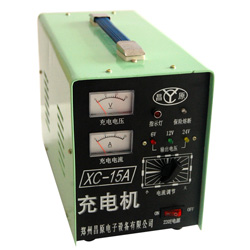 技术指标 1、使用电源:交流220V±10 50HZ 2、输出电压:6—24V 可调 3、最大输出电流15A可调 4、颜色:浅绿色工作效率:≥86% 功率因为≥0.85 绝源强度输入对外壳和输出≥AC1500V 输出对外壳≥AC1000V 平均无故障时间≥900H 工作温度(-20~100)℃ 贮存温度(-40~60)℃ 相对湿度:90%(40±2℃) 大气压为(60-106)KPA XC系列充电机设计新颖,使用安全、方便,充电快速、适用性强。且外观漂亮、包装精美,充电机内的变压器全都采用纯铜漆包线绕制配备进口全桥经精心设计而成,电转换率高,电损减到最低。产品具有快速充电作用,设有三档充电电压选择,耗电少、功率大,物美价兼适合于民用电池及其它小型蓄电池充电最佳产品具有完善的保护功能。因而具有极高的性价比。本机器适用于范围为:6V、12V、24,标称容量为:4-150Ah的蓄电池进行快速充电。!注意:充电时间应该在10小时左右为宜,电流的调节以电瓶的容量十分之一为好,如在12小时内未能充满,请选用我公司生产的充电电流更大的其他型号机器!