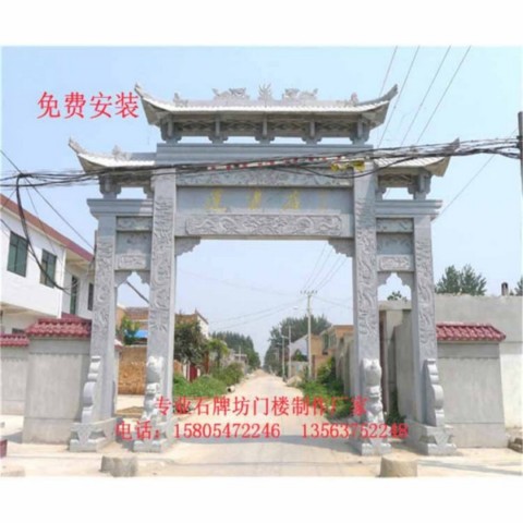 牌坊又名牌楼,最早起源于我国早期城市中的里坊制度。因每坊为自成一体的居住区,四周有围墙围合,仅在门中间筑房门,故名牌坊。后来牌坊成为建于街道、衙署、寺庙、陵墓、园林前的衬托性建筑。其作用亦因地而异,建于街道上的牌坊,用于分割街区,美化街景;建于园林的石雕牌坊,用以点缀风景,美化山水;建于寺庙、陵墓前的牌功,用以烘托庄严、肃穆的氛围。后来石雕牌坊又演变为表彰忠臣孝子、节妇烈女的功德坊和贞节坊等。石牌坊石牌楼,五门五楼样式
