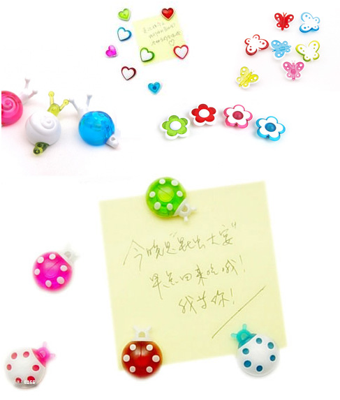 描 述:可爱冰箱贴,做工精致,没有任何的毛刺,很光滑,颜色鲜艳,磁铁固定结实牢固。款式多样:心形、瓢虫、蝴蝶、小蜗牛、小花等可选择哦,把简单的留言条,打扮的引人注目,漂亮可爱~