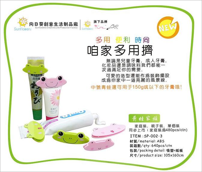 很卡通很实用的咱家多用挤出来了,有老虎,猪猪,青蛙,KT等卡通造型哦,咱家多用挤分大中小三种型号,有家庭装,亲子装,单个装三种。可用于儿童牙膏,成人牙膏,化妆品,调味料等等.