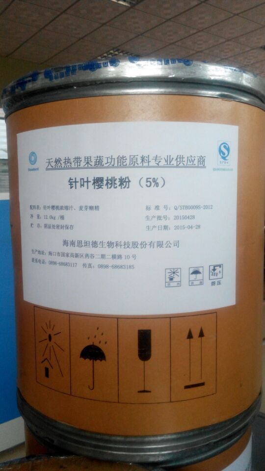 海南思坦德生物在海南省定安县、屯昌县具有千亩针叶樱桃种植基地,是在针叶樱桃果6-7成熟时(此时其天然维生素C含量最高)采摘新鲜、果型饱满的优质樱桃,采用国际先进的低温提取和喷雾干燥技术精制而成,产品完整地保存了针叶樱桃特有的色香味和营养成分,具有口感佳、流动性好、抗吸湿性强的优点。