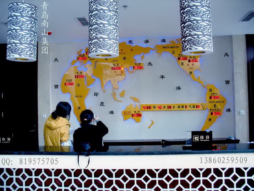 新款酒店地图钟改变了过去酒店用世界时钟粗糙生硬的工艺,为宾馆、酒店大堂迎来了新时代的艺术装饰效果,令来宾步入大堂,世界各城市时间一目了然,全屏生动活泼。