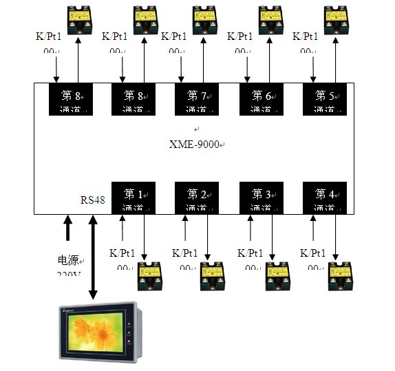 在许多需要多路温度控制的场合,一般采用多台单回路的温控器或者使用使用PLC实现多路温度控制目标,前者操作、维护简单但联动性不强,后者整体性强但需要通过比较复杂的编程才能实现,针对以上情况,我们推荐XME9000+触摸屏即可实现9路温度实时控制。操作人员直接通过中文显示的触摸屏进行操作,比操作仪表和记录仪更直观简便。这样的系统不仅具备计算机的记录与联网功能,而且操作又不像台式计算机那样脆弱、复杂和不能在现场应用的缺陷,它可以像仪表一样运用于现场,且操作简单方便。