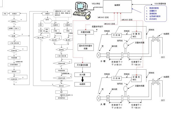 本系统适用于化工、制药等行业需要进行多种配料管理的场合,其中不少液体配料属于小量加注,要求精度高,我们充分利用涡轮流量计准确度高的特性,配合定量控制器以及系统软件的智能化,可以实现用户对配料管理的目的。