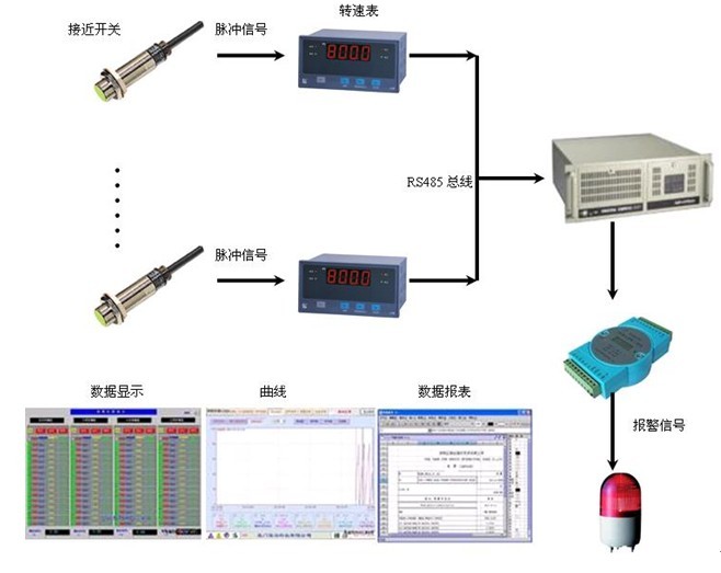 2、 中间层采用XMS脉冲输入转速表,将接近开关脉冲信号转化为对应的转速数值,4位显示,精度0.1%,同时将数据转发给工控机。