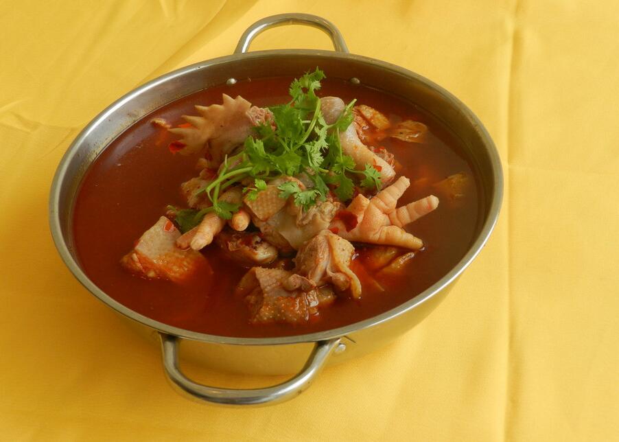 烧鸡公是源自於重庆的祖传秘方,是一种以小火闷煮的料理方式,烧鸡公即是以十多种中药以及香料去炖煮的汤头,并采用全鸡肉下去料理,搭配新鲜蔬菜,汤头味道香浓并充满独特中药香,是一道独特且美味的料理。
