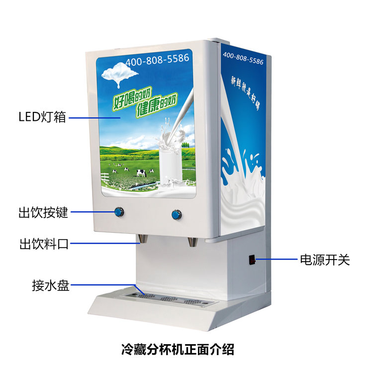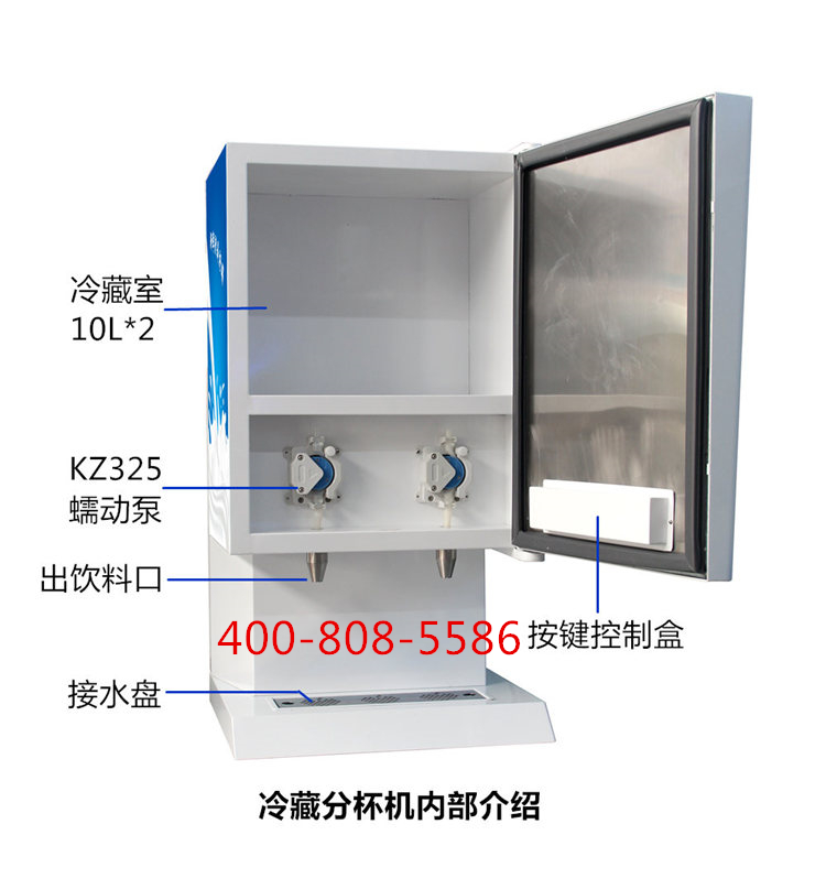 乳酸菌饮料冷藏分杯机可同时任意放置2种10升标准包装的液态奶制品或成品液态饮料(伊利,蒙牛,营养快线/爽歪歪,银鹭,旺仔,小洋人妙恋,完达山,汇源,养元,得益,唯怡,天友,迎春乐,李子园LIZIYUAN,夏进,君乐宝,优酸,娃哈哈,达利园,今贝,台福,黑牛,露露,大寨DAZHAI;等等软饮料乳酸菌饮料知名品牌)。额定电压:220~240V/50Hz,功率:50W,净重:28.5KG,外形尺寸:380*452*810MM(宽*深*高),冷藏温度2至6度;更适宜饮料存放,人机友好的全塑奶盒设计,单个人不用一分钟即可轻松实现包装的装载更换;乳酸菌饮料冷藏分杯机优化的阀体,内嵌的安装结构,能有效防止冷气泄漏;优化的阀体设计,能适应管径Ф11~Ф15mm的所有产品,保证奶管在可靠锁紧的前提下,打杯力量最小化;可拆卸阀体,清洗方便;304不锈钢,高档,易清洁。外形简约时尚,漆面用烤漆,高档易清洁,操作轻松便捷;冷藏室可同时放置2个10升标准包装的液态奶制品;首次采用通过蠕动泵弹性输送软管交替进行挤压来释放泵送液体,使打杯更加平稳。。酸奶冷藏分杯机被广泛适用于:自助餐、中餐店、西餐厅、水吧、街饮、娱乐场所等渠道。服务热线:4OO-8O8-5586