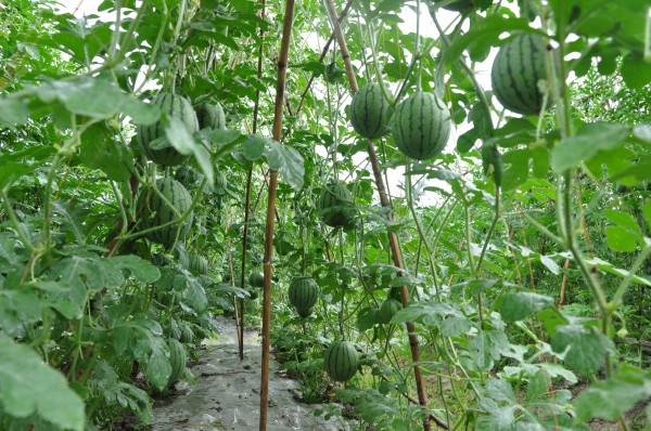 多蔓整枝 小西瓜前期长势弱,以轻度整枝为宜。在第5叶时摘心,子蔓抽生后保留3条长势相近的子蔓,其余的子蔓剪除。蔓间保持18-20厘米,均匀排列于畦面。坐果前,剪除子蔓上抽生的侧蔓,减少养分消耗,促进开花坐果。