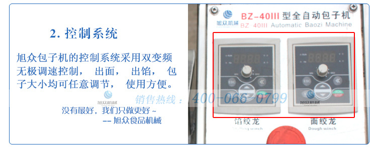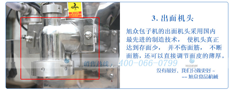 5:结合以上特性,再配合磨具的搭配,我们此款机型成品大小经测试可在15-180克之间任意调节,在150克以下成品皮馅比例更可达1:1,对于灌汤包等可达1:2.5以上。适合所有水晶包,小笼汤包(灌汤包,煎包),糯米包(青团,米果,红果),菜包,肉包,豆沙包,流沙包,叉烧包,玉兔包,圆馒头,玉米饼等。另配组合机还可以做刀切(方)馒头。酵母面,醒发面,二次发面均可做.一款机型解决全部产品,当之无愧的万能包子机王!此机型适合所有个体连锁包子铺,机关(部队)学校单位食堂,配送中心(早餐工程),食品厂等使用,价格适中,性价比全球最高。也适合创业人士的优先选择!