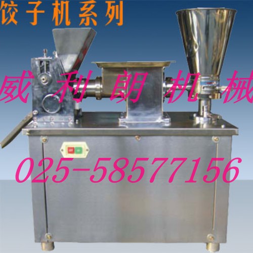 1、该机采用模拟手工饺子的压片包合的成型特点,双控双向定量供料原理,生产时不需另制饺子皮,只需将面团与馅料放入进料口,开机即可自动生产出饺子。