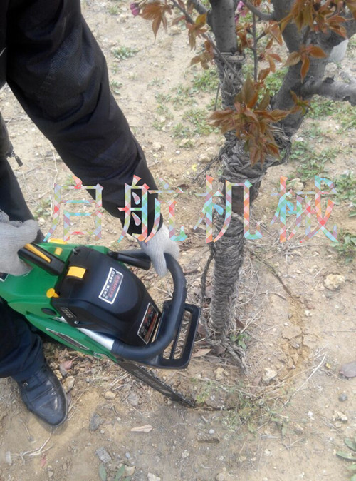 3、便携式挖树机有着“体积小、重量轻、强度高、油耗少、噪音低、易于携带、结构简单、操作方便、坚固耐用、造型美观、故障率低、易于维护、安全可靠、质优价廉”等特点,加之人性化设计的操作系统更适应普通人的操作使用,尤其是设计合理的减震装置能有效地克服机身工作时70%以上的反作用力,使操作者能够在轻松的工作环境下进行有效地工作,是一种符合我国园林生产特点及国情的现代化理想的工具设备。目前,带土球起苗法是园林苗木移栽中成活率最高的方法,但是此法人力参与量多、劳动强度大、工作效率低、施工费用成本高,而且施工中很难锯断根系,容易造成苗木根系的意外损害。而这款便携式苗木断根机成功地解决了这些难题,使苗木移植变得轻而易举。能极大提高人工挖苗的效率及提高苗木的成活率。它可轻松地切入红壤、棕壤、褐土、黑土、栗钙土、漠土、潮土、灌淤土、水稻土、湿土(草甸、沼泽土)、盐碱土、含石块的岩性土和高山土等12系列土石中。并切断泥土石中的树根及夹杂的石块。主要用于苗圃,园林工程,高山取苗等苗木移栽过程中带土球的挖取、装桶或淘汰林木的采伐更新。
