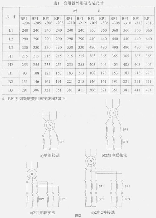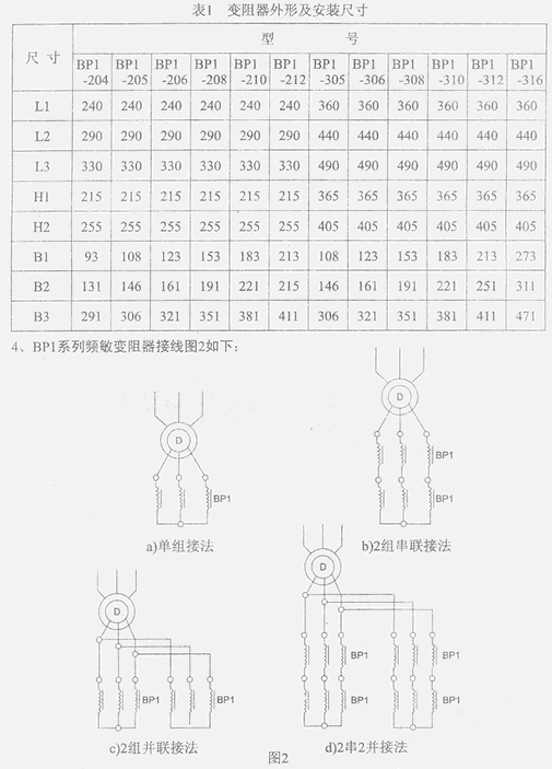 变阻器实质上是一个铁芯损耗非常大的三相电抗器。它由用数片E型钢板叠合成的铁芯及线圈两个主要部分组成。钢板间加一垫圈,保持片间距离,以利散热。结构及安装尺寸见图1和表1.
